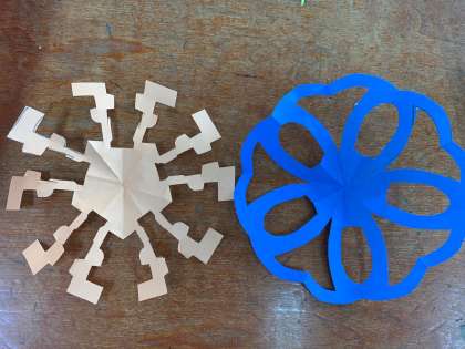 図工の授業で、折り紙を使って日本の伝統文化の「紋切り遊び」に挑戦してみました。折り方が少し複雑で難しそうにしていましたが、はさみで切ってそっと広げてみると、とってもきれいな模様が現れました。「うわ〜きれいな模様ができた!」「こんな模様になるんや!」と嬉しそうに言っていました。