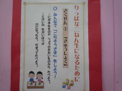 りっぱな2年生になるためにも、まずは作戦その1として、給食を時間までに食べ終えることができるように頑張っていきます!!