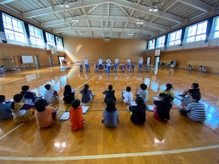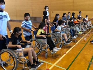3年生は障がい者教育として、車いす体験に取り組みました。講堂に集まって、車いすのことやバリアフリーの座学を受けました。
