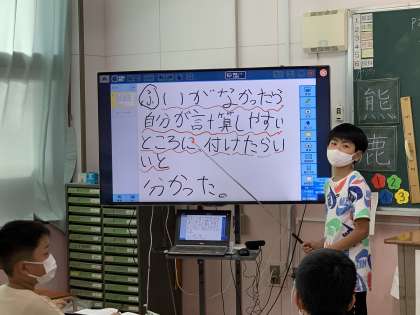 その振り返りをタブレットの発表ボードに書く練習と全体での発表の仕方を学びました。