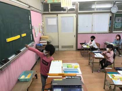 今、算数ではたし算の学習をしています。自分の考えを黒板でみんなに説明します。1年生になってこのような発表の仕方を初めてしましたが、みんな上手でびっくりしました。考え方も子どもたちのそれぞれのものがあって、1年生と授業をするのは楽しいです。
