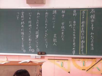 自分たちのの生活を振り返りより良くするために、アンケートをとり、報告するという学習です。