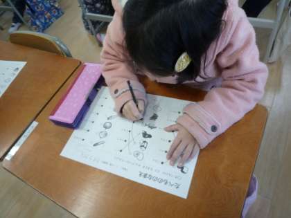 「たべものたんけん」と題し、さまざまな食べ物の名前や今日の給食に使われている食材の名前など、プリントのクイズを解きながら教えていただきました。
