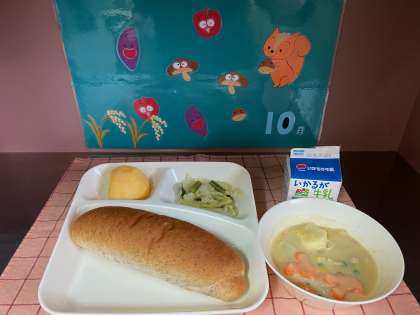 また、コーンクリームシチュー(米粉)に「プーさん、ミッキー型」の「ラッキーにんじん、じゃがいも」を給食調理員さんが作ってくれました。