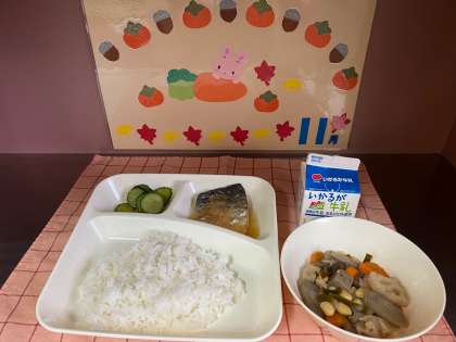 今日の給食では、「大豆と冬野菜の煮もの」の献立に「大豆」が入っていました。