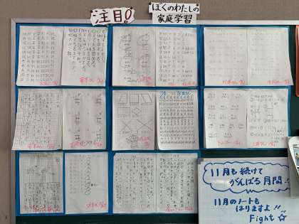 わり算の筆算やローマ字、漢字の学習、日記や調べ学習など、バラエティにとんだ全員のノートを掲示することができました!!!