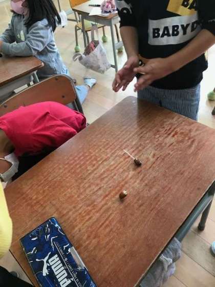 せいかつかの学習で、秋探しで見つけたものを使っておもちゃを作っています。今日はパート1、どんぐりごまです。学校の穴あけ機でどんぐりに穴をあけ、つまようじをさしたらできあがり。みんなでどれだけ回るかくらべっこ。楽しい1時間でした。