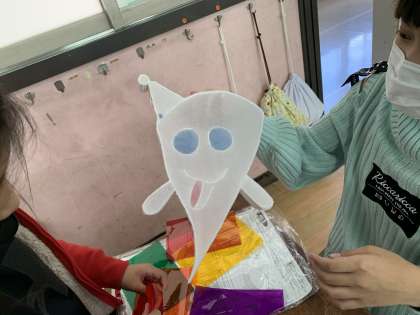 犬やねこ、魚やおばけといった思い思いの形が、カラーセロハンによって、光にかざすと色鮮やかな立体作品へと仕上がりそうです!!