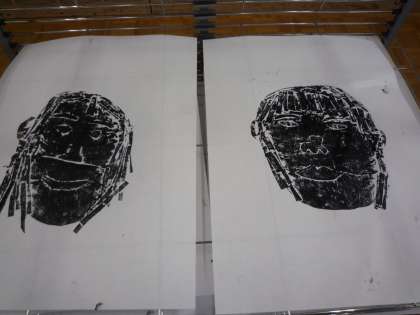 今までこつこつと作ってきた自分の顔が、ローラーでインクをつけると真っ黒に!