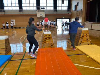 体育の学習で、跳び箱の指導をしてもらいました。まず、マット運動で前転や後転、側転をしてから跳び箱をしました。開脚跳びや閉脚跳び、台上前転などいろいろな跳び方にチャレンジし、手の付き方や姿勢などを教えてもらいました。みんな積極的に跳び箱の段数をあげて跳んでいました!