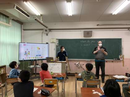 先週と今週の外国語の時間は、マニー&ハマニーの2人の先生による学習をしています。