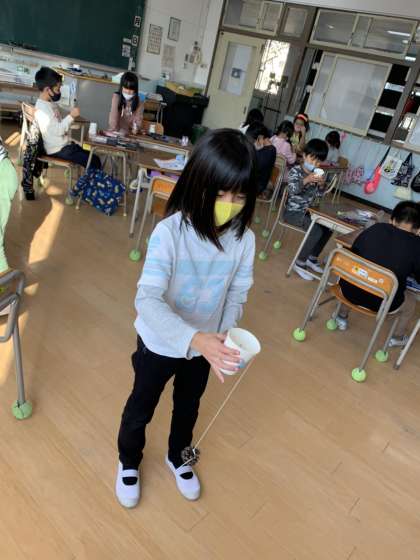 紙コップのまわりに絵をかき、そして、まつぼっくりを糸にくくりつけて、糸を紙コップにセロハンテープでつけて、完成です。