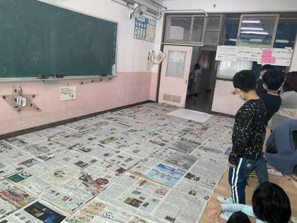 今日はみんなで1平方メートルを新聞紙で作り、その新聞紙を敷き詰め、教室の面積を測りました!