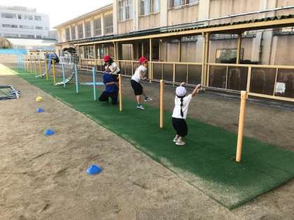 体育で鉄棒運動に取り組んでいます。継続して取り組んでいると、少しずつですが握る力がついてきて、飛び乗ったり、ぶら下がったりするのがうまくなってきています。