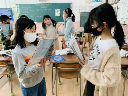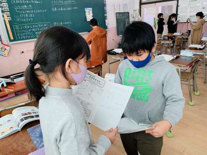 いつもは隣の人とのペア交流ですが、今日はたくさんの人と交流しようとペアを探しての自由交流をしました。