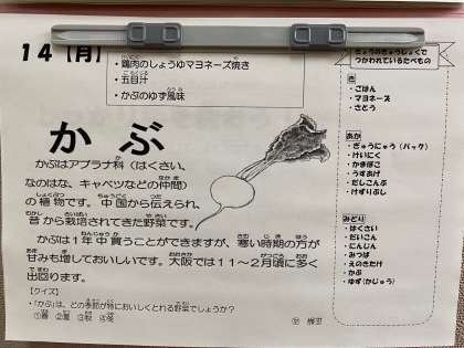 今日の給食献立では、「かぶのゆず風味」が登場しました。