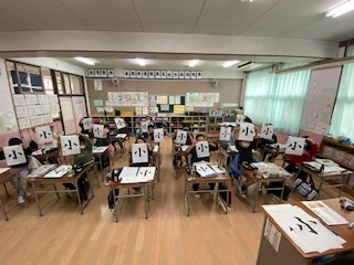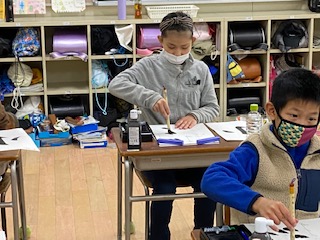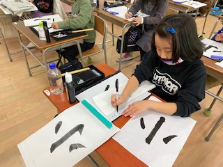 今日は2学期最後の毛筆の学習です。基本の点画も残すところあとわずかです。準備も素早くできるようになりました。今日のお題は小学校の小という字です。点とはねを意識して学習しました。