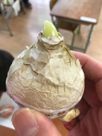 せいかつかの学習で、たまねぎのような何かを観察しました。みんなに聞いてみると、「チューリップの種!」という意見が多かったです。ヒヤシンスの球根だと伝えると、興味津々で観察に取り組んでいました。何色の花が咲くのかな。