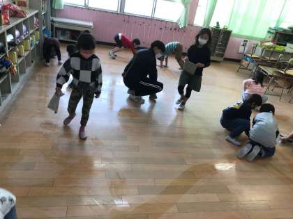 今日はみんなで床ふきをしました。ゴシゴシと力強くふくと、黒ずんだ床の汚れがとれました。気持ち良い教室で新年を迎えられそうです。