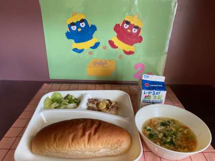 今日の給食で登場するのは、もち米と焼き豚、くり、干ししいたけを味つけして蒸した中華おこわです。