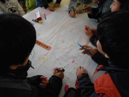 その後、「もしも城北公園駅ができたら」自分たちの街を自分たちで考えました。イオン、遊園地、スタジアム・・・「こんなものがあったら住んでて楽しいな。」というアイデアがどんどん浮かんできて、楽しんで夢の街をつくっていきました。