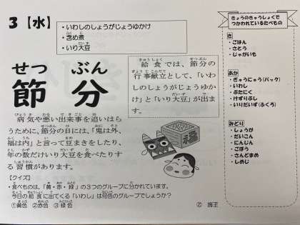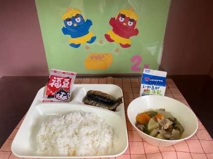 給食では、節分の行事献立として、いわしといり大豆が登場しました。