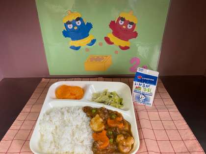 今日の給食の「ハヤシライス」の中に、「ミッキー型・プーさん型」をした「ラッキーにんじん・ラッキーじゃがいも」を給食調理員さんが作ってくれました。