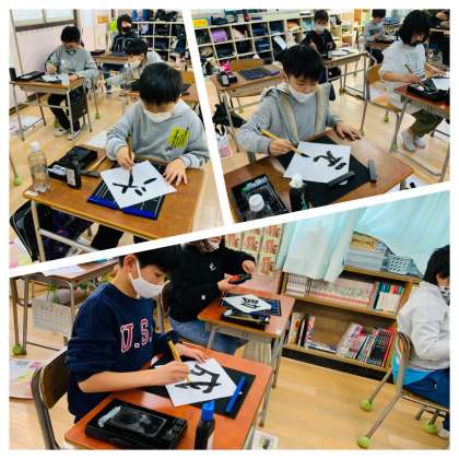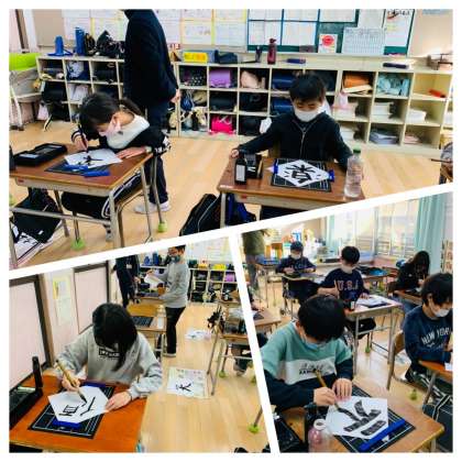 今日の学級活動では、これまでの自分を表す一文字とこれからの自分の目標を表す一文字を習字で書きました。