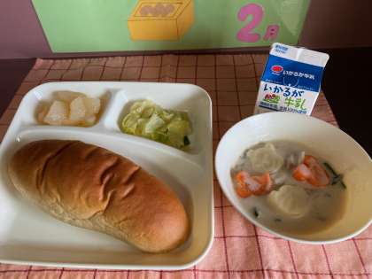 「ほうれんそうのクリームシチュー」の中に入っている「プーさん型・ミッキー型」の「ラッキーにんじん・ラッキーじゃがいも」は、給食調理員さんが作ってくれました。