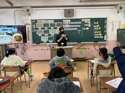2時間目に3年生で「豆を食べよう」、6時間目に4年生で「よくかんで食べよう」の栄養指導を行いました。