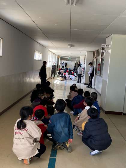 今日、地震・津波の避難訓練をしました。子どもたちには、どの時間に訓練するかは伝えずに行いました。子どもたちは、いつ放送が流れるのか、緊張している様子でした。放送が流れたのは、15分休みでした。運動場にいる子、教室にいる子、トイレに行っていた子など、どの子も頭を守りながら、すばやく避難することができていました。また、津波が来ることを想定し、全員で4階にもスムーズに避難することができました。
