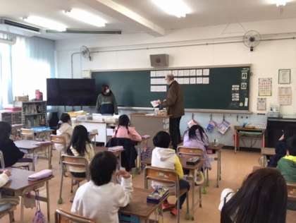 そして、避難訓練後に、事後指導を受けたあとは、マニー先生による楽しい外国語の授業でした。