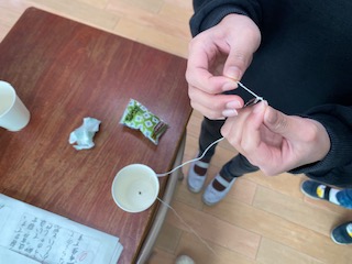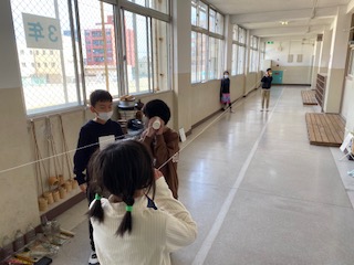 最近3年生の理科では、音の性質について学習しています。今日は音が伝わっていくときに、ものの様子がどうなっているのかを調べるために、糸電話を製作しました。糸電話を使ってみると、思ったより離れてみても、声が聞こえることにびっくりだった3年生でした。ぴんと張った糸を握ってみると、声が聞こえなくなることにも気づきました。たのしく学習することができました。