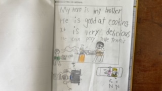 英語の学習で自分にとってのヒーローを紹介しました。お母さんや友達、スポーツ選手など自分が尊敬する人を英語で発表しました!料理が上手、英語が話せる、走るのが速いなど尊敬する人のいいところやできることをたくさん見つけて発表していました。