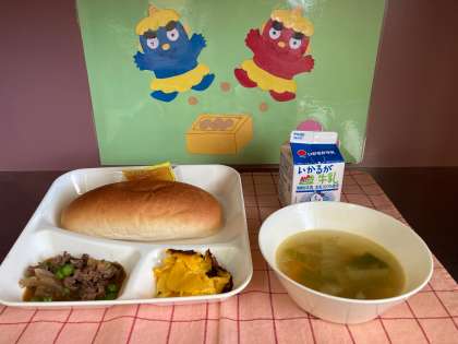 今回の給食では、鶏卵、牛乳、クリーム、砂糖にかぼちゃペーストを加えて蒸し焼きにした、プリンが登場しました。