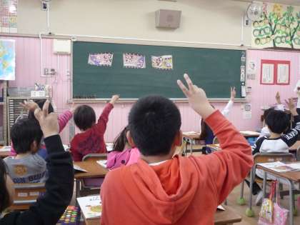曲調の変化に気づけるように、黒板に貼ったイラストをもとに、変わったところで手を挙げることにしました。