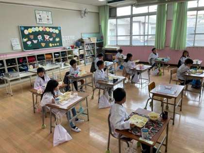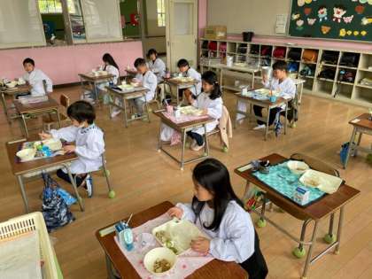子どもたちは、バランスのとれた美味しい給食をモグモグ食べてます。