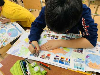 地球には六つの大陸と三つの海洋があること、赤道から北を北半球、南を南半球と言い、位置を表すには経度や緯度を使うことなど、新しいことをたくさん学習しています。