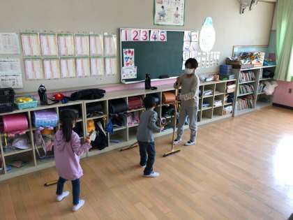 優しい6年生が、ほうきのにぎり方、はき方を教えてくれて、一生懸命取り組んでいます。ほうきが大きく、うまく使えなくて苦戦している様子でした。