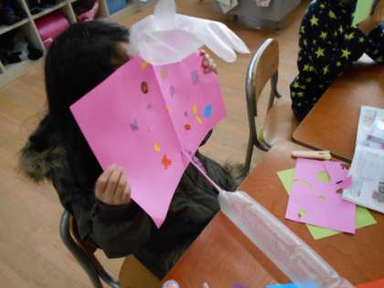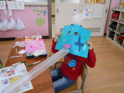 完成したおめんにかさ袋とビニール手袋をつけて、ふくらませると、、、、おもしろーいおめんになりました!子どもたちも大満足の作品に仕上がりました♪