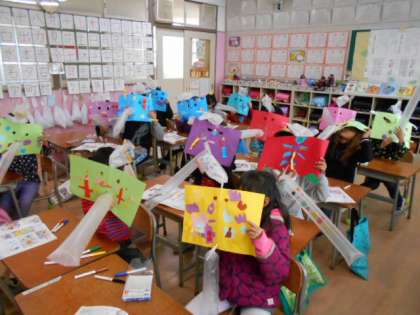 図工でつくった「ぷくぷくおめん」が完成しました!!