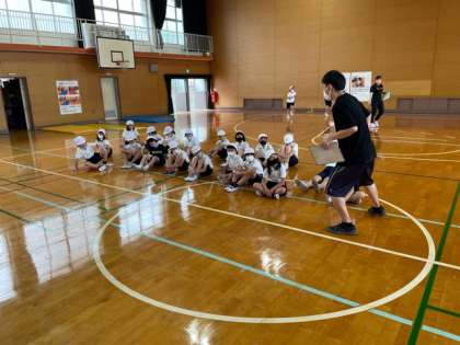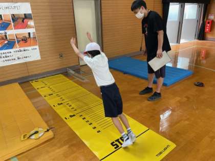 体育館の壁面には、少しでも記録を伸ばすためのポイントが書かれていて、子どもたちはそれを見たり、先生たちの話を一生懸命聞いたりして、本番にのぞんでいました。