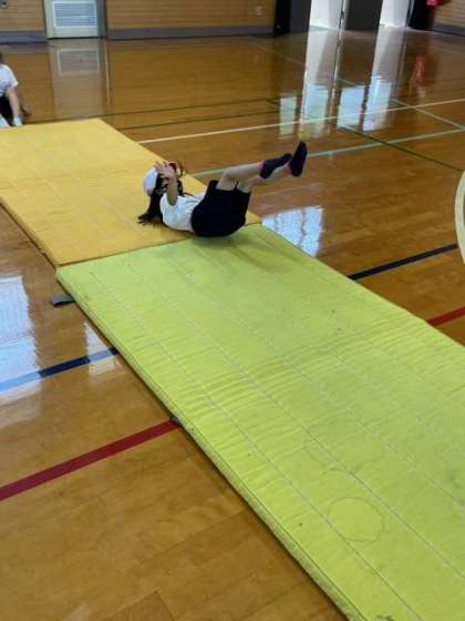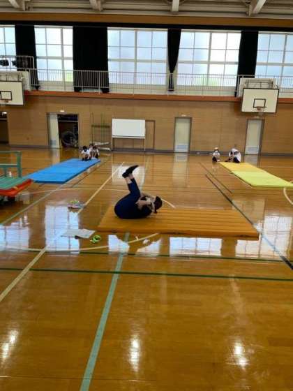 今日は1年生になってから初めてのマットあそびなので、ゆりかご、だるまころがり、まえころがりなど、簡単な動きをいろいろとしました。