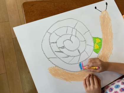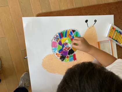 図画工作科の時間に、かたつむりを作っています。自分で好きな色を使ってしっかり塗り込んでいます。どんなかたつむりができるのか楽しみです!