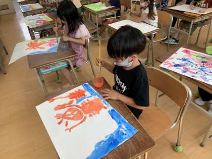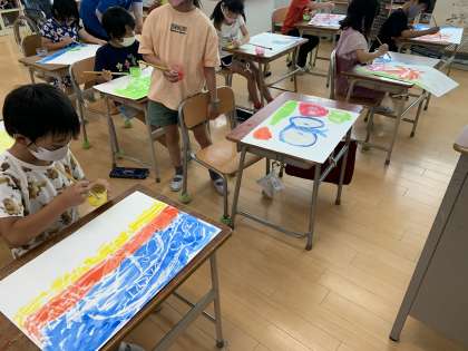 絵の具をはじくことに子どもたちはびっくりしていました。