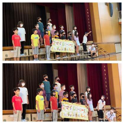 毎年、1学期の人権集会は学級目標を発表しますが、今年は目標に加えて、学級の歌を決めたので、その歌声も発表します。