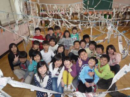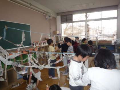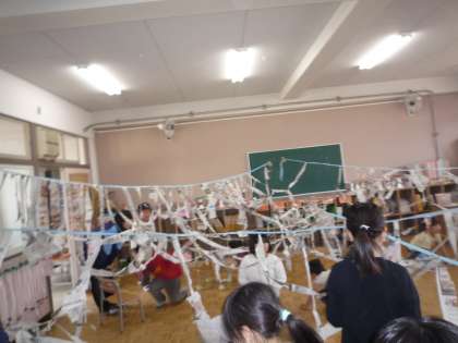 と声をかけると、協力して、どんどんつながっていき、写真のような教室に大変身しました。もちろん、新聞紙はひとかけらも残っておらず!!!