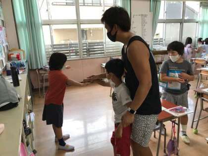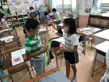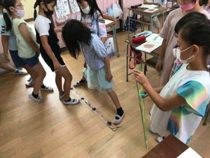 長さの学習に取り組んでいます。今日は教室のたての長さ、横の長さについて調べました。教室にあるものではかるというルールを設け、みんなで知恵を出し合い、助け合いながら調べることができました。ところでその長さ、正しいのでしょうか?次回、巻き尺の登場。