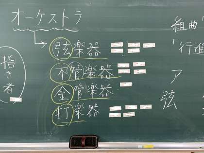 そして鑑賞曲「行進曲風に」を聴き、旋律を奏でている楽器は、弦楽器、木管楽器、金管楽器、打楽器のどれかを聴き取る活動をしました。