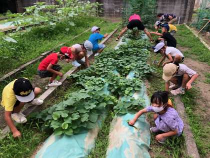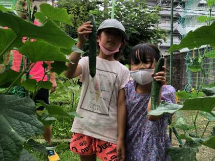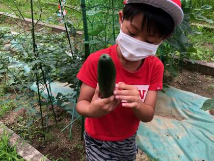 今日は、生活科で学習園へ行きました。学習園では、さつまいもやきゅうり、ミニトマトを育てています。畑の草取りをがんばりました。きゅうりの収穫もできました。大きいのが取れて喜んでいました。ぜひ、ご家庭でおいしくいただいてください。名前順で収穫しています。たくさん収穫できるといいですね。